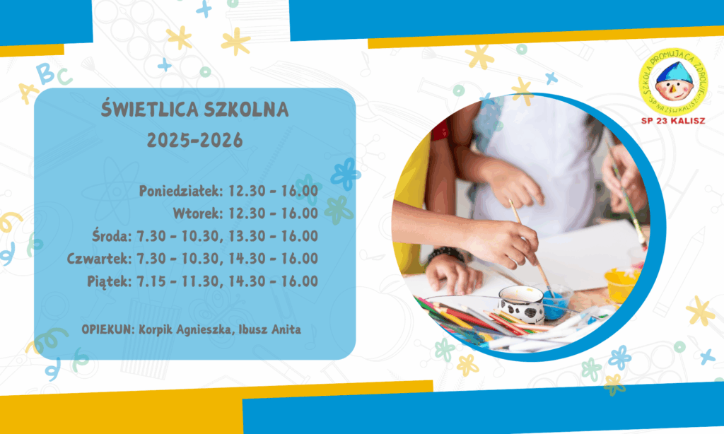 Informujemy, że w naszej szkole działa świetlica szkolna, w której uczniowie mogą spędzać czas przed i po lekcjach w bezpiecznym i przyjaznym środowisku.